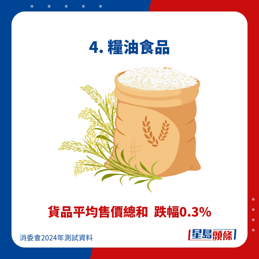 在消委會調查的10款食米中,除了袋鼠牌低升糖指數白米2公斤及熊井美國珍珠米3公斤沒有減價外,其馀8款食米的平均售價都有下跌,包括金象牌頂上茉莉香米5公斤下跌5.5%、賣$65.4;金象牌頂上茉莉香米8公斤下跌3.6%、賣$95.4;袋鼠牌精選絲苗米8公斤下跌4.3%、賣$86.6等。當中北連北海道七星無洗米2公斤的跌幅最大,下跌7.6%、賣$114.2。