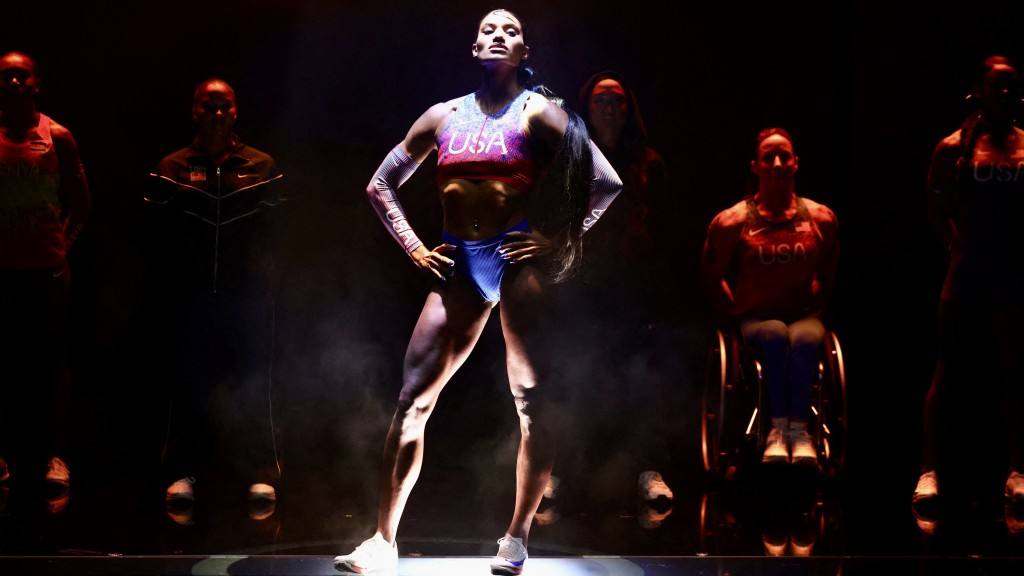 ▲美國跨欄選手科克雷爾(Anna Cockrell)擺出姿勢展示巴黎奧運美國隊田徑制服。 路透社