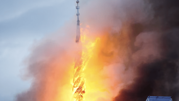 ▲擁有400 年歷史的丹麥哥本哈根“老證券交易所”大火,屋頂被火海吞噬,象徵守護丹麥商貿風調雨順的“龍尾尖塔”頽然倒塌。路透社