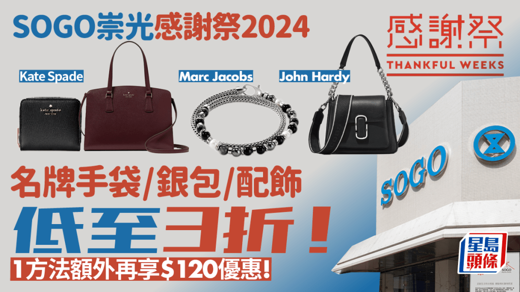 SOGO感謝祭2024|SOGO崇光百貨每年都會舉行SOGO感謝祭優惠,讓大家能以最抵價買到心頭好!今年SOGO感謝祭快將開鑼,其中SOGO崇光網店會率先預售多款商品,Kate Spade、Marc Jacobs、John Hardy手袋及配飾等低至3折發售,最平$690可入手人氣品牌產品,買滿指定金額還可以額外再享優惠!