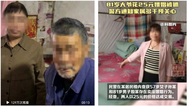 這條新聞是:“近日,四川瀘州警方通報,民警在某居民樓內查獲57歲女子孫某和81歲男子殷某,經查,孫某將殷某帶至出租屋以25元的價格達成交易,實施賣淫嫖娼行為。警方通知男子家屬,要求及時對其進行家庭干預和關心。目前,兩人因賣淫嫖娼被依法行政處罰?!?/p>