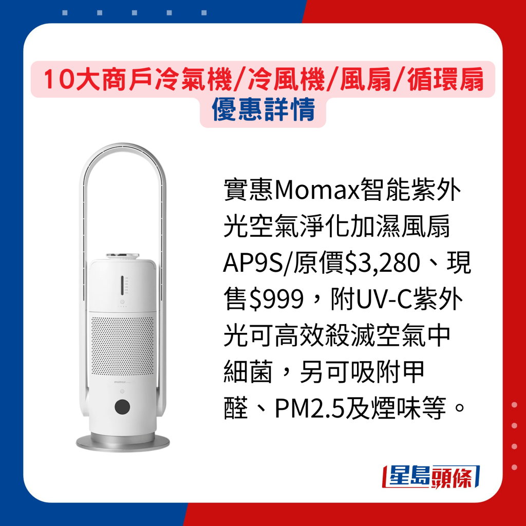 風扇或循環扇都是夏天必備法寶,但應如何挑選?首先要了解兩者的分別!傳統風扇的設計,以快速降低人體溫度功能為主,而循環扇則主要通過渦旋式的送風方法,令室內每個角落的空氣可以循環流動,從而降低室內的溫度。 市面不少風扇或循環扇更有額外提供空氣凈化及袪除異味等實用功能,可因應個別需要選購。 作為精明消費者,不妨先留意商戶提供的優惠,如Pricerite實惠就由即日至4月29日,于線上線下或手機應用程式購買精選風扇,可享低至85折,其中原價$3,280的Momax智能紫外光空氣凈化加濕風扇,更減至$999。