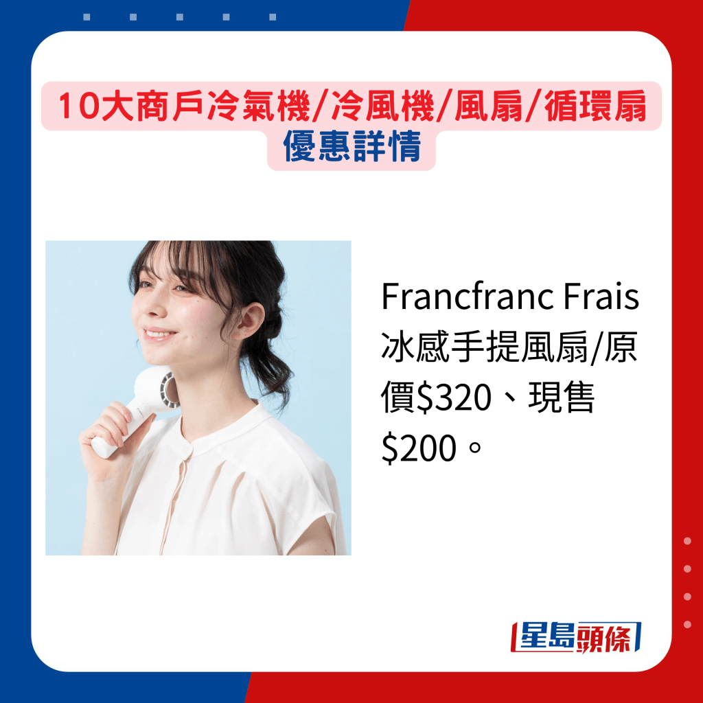 另由即日至4月28日,Muji無印良品專門店及網店同步舉行會員專享活動,選購手提風扇或家居風扇皆可享額外9折。 同樣日系的Francfranc專門店及網店,由即日至4月30日,選購指定產品滿3件,即享9折,當中包括冰感手提風扇及便攜式風扇。