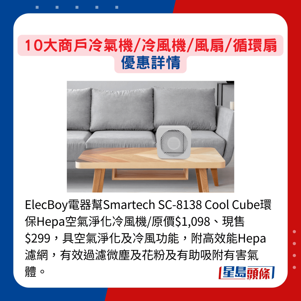 除風扇以外,冷風機在近年大行其道,原理是熱空氣透過水簾帶進冷風機內,并轉化成涼風,從而達到降溫效果,惟降溫范圍局限于出風口。 若想入手冷風機,現可趁有信用卡優惠購買更劃算。 輕電器網購平臺電器幫ElecBoy由即日至4月30日舉行購物節,逾千款商品低至4折,若以指定信用卡簽帳及輸入優惠碼,更可享高達總值$190的銀行購物優惠,若同時加購TotalCover延長保養服務即享限時9折,另還可以低至47折加購指定產品。友和亦有推出多項信用卡優惠,其中包括逢周五及周六以Mastercard單一消費滿$1,500及輸入優惠碼即減$80。