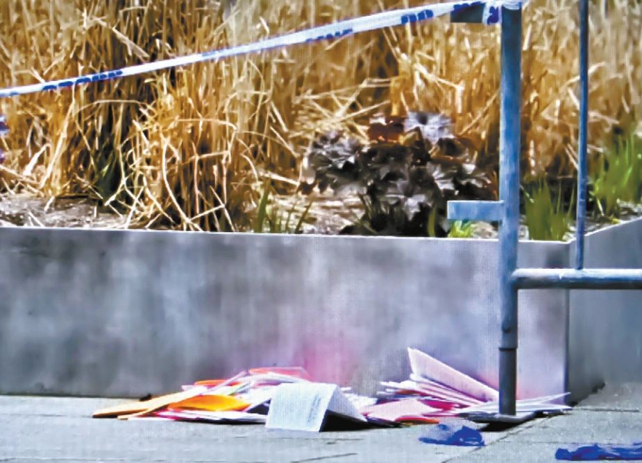 ▲自焚事件后,現場發現該男子向人派發的“反政府陰謀論”傳單。電視截圖