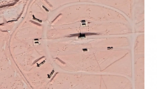 ▲2021年10月拍攝的衛星圖像,顯示今次遇襲的伊斯法罕空軍基地的防空系統。雷達系統位于中間的土丘上,左側可以看到四個導彈發射器。
