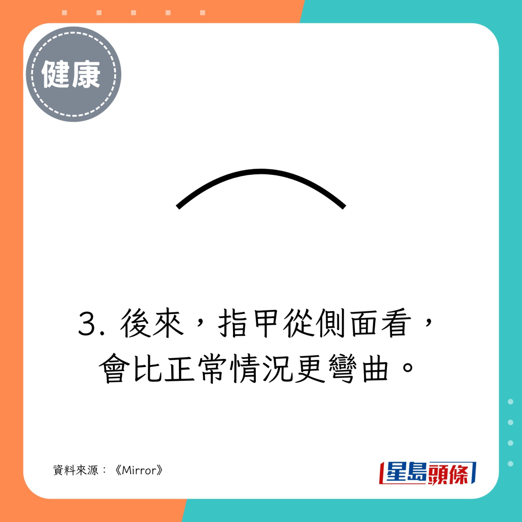 后來,指甲從側面看,會比正常情況更彎曲。
