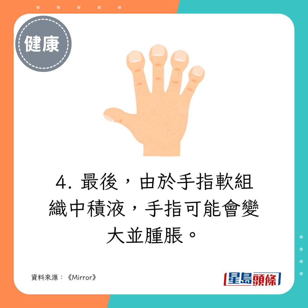 最后,由于手指軟組織中積液,手指可能會變大并腫脹。
