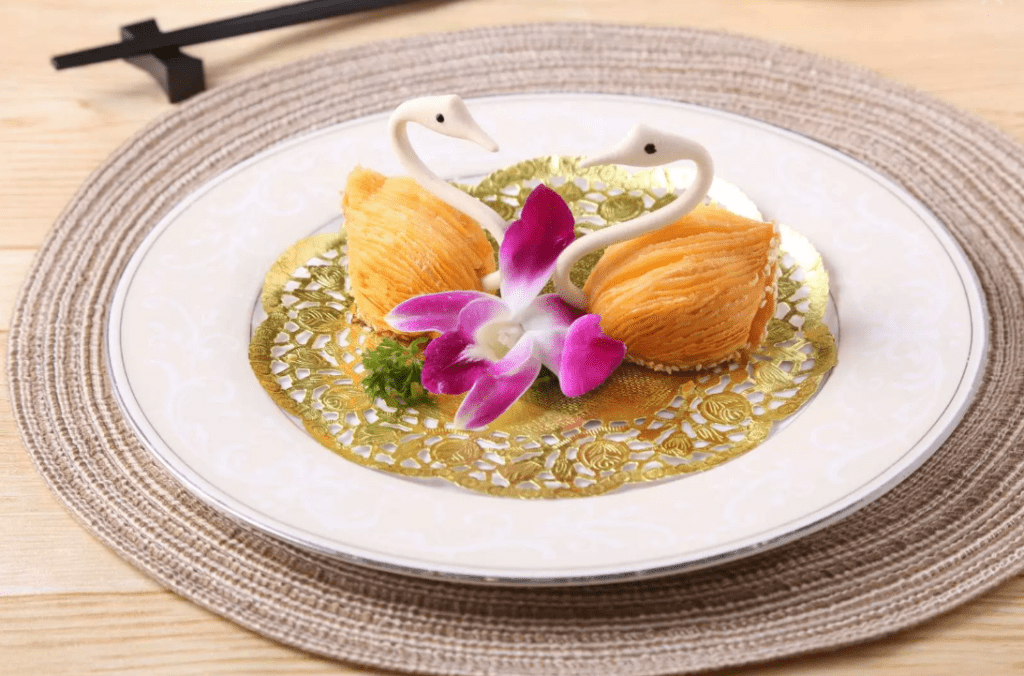 *新中式點心可選︰子姜皮蛋蝦春卷、別有洞天鴛鴦腸、安格斯和牛天鵝酥、翠綠小梨子、和牛香煎餅、姬松茸遼參粉果、乾燒糯米釀雞翼、一口鮑魚鳳眼餃、荷葉紅米珍珠雞、蘿卜千絲酥、鮮蝦脆皮紅米腸
