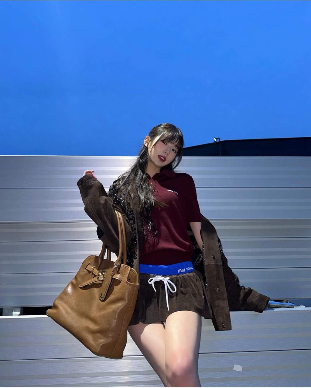 ▲韓團IVE成員張員瑛以Polo衫襯束繩迷你裙,再配以大號皮革Tote Bag,造型剛柔兼備。(圖片來源:IG@for_everyoung10)
