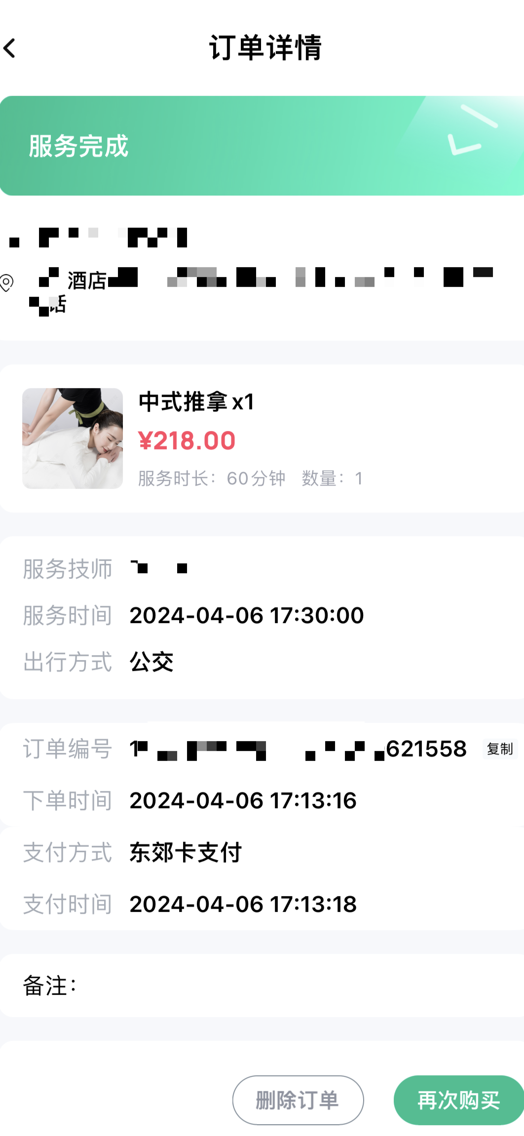 趙先生透露,4月6日下午,他因為出差工作勞累,于是使用東郊到家平臺預約了一個200多元的酒店內上門按摩,服務內容是中式推拿。