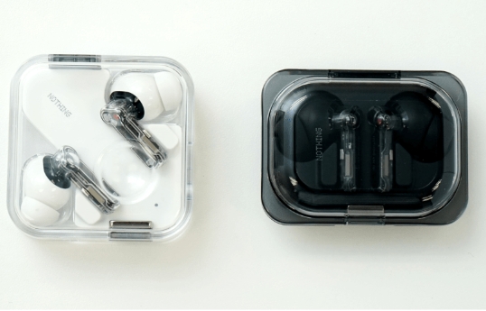 ▲Nothing Ear(左)及Ear (a)(右)沿用透明設計風格,惟Ear (a)充電盒以長方形示人,并帶有橢圓形浮泡。