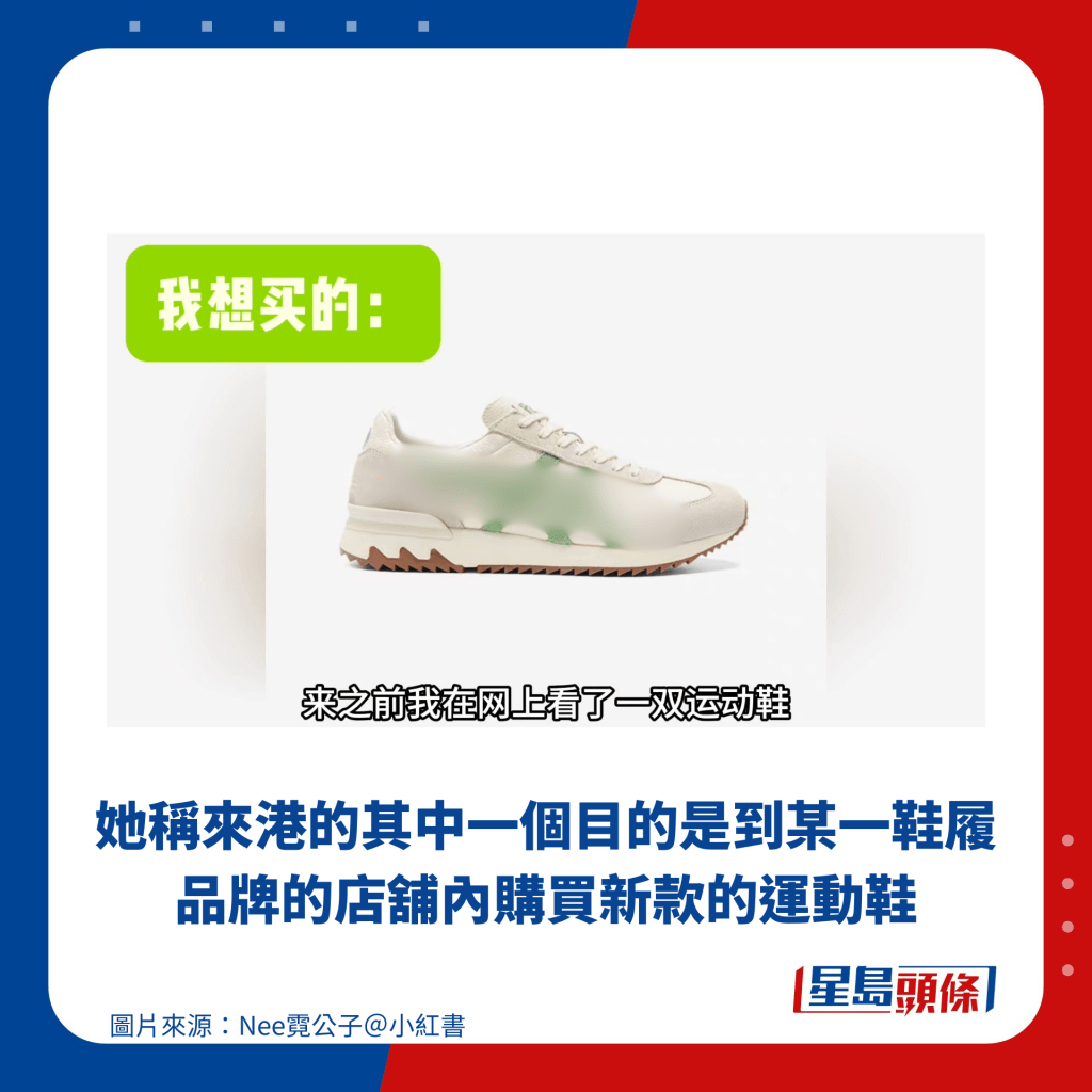 她稱來港的其中一個目的是到某一鞋履品牌的店鋪內購買新款的運動鞋