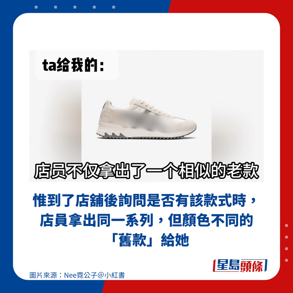 ▲惟到了店鋪后詢問是否有該款式時,店員拿出同一系列,但顏色不同的「舊款」給她