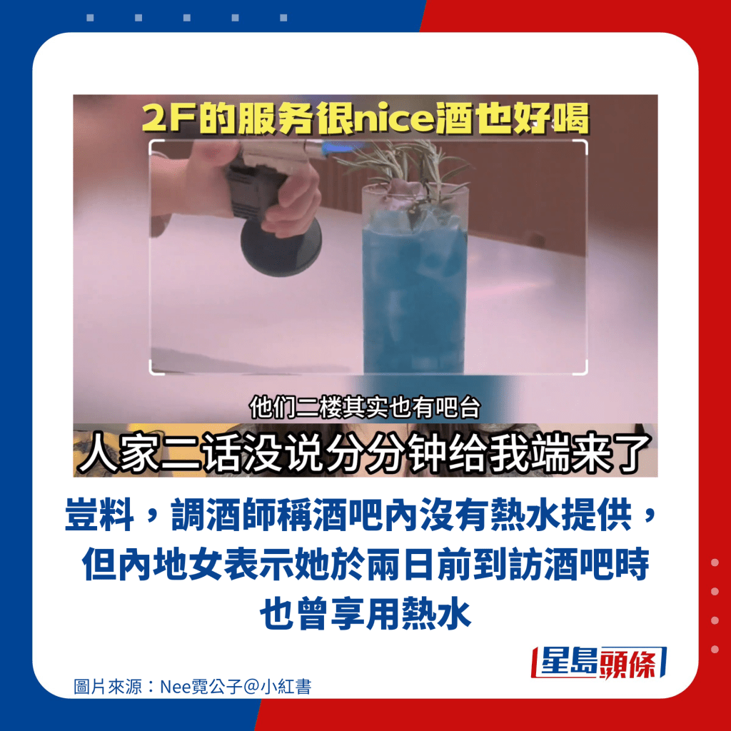 ▲豈料,調酒師稱酒吧內沒有熱水提供,但內地女表示她于兩日前到訪酒吧時也曾享用熱水