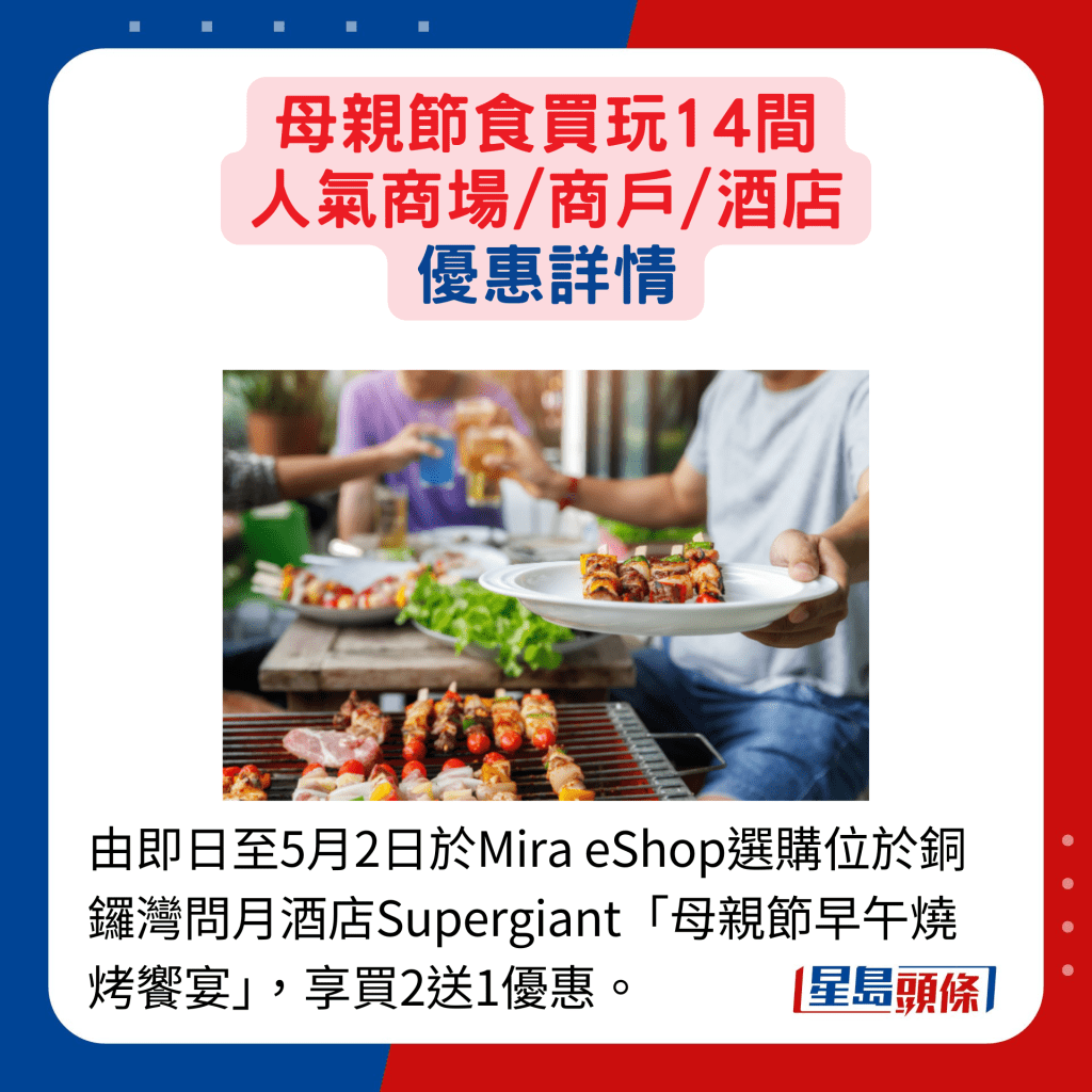慶祝母親節,嘆美食是必備環節。北角海逸酒店綠怡咖啡廳母親節自助早午餐及晚餐,于5月12日惠顧,每位媽媽可免費獲贈紅絲絨蛋糕。若經酒店eShop預購,可享優惠如買2送2(購買2位成人,同行2位客人(成人/長者/小童)免費,又或購2位成人,其中同行1位母親免費等。至于銅鑼灣問月酒店的Supergiant推出“母親節早午燒烤饗宴”優惠,于5月2日或之前在美麗華集團網店Mira eShop選購,可享買2送1優惠。