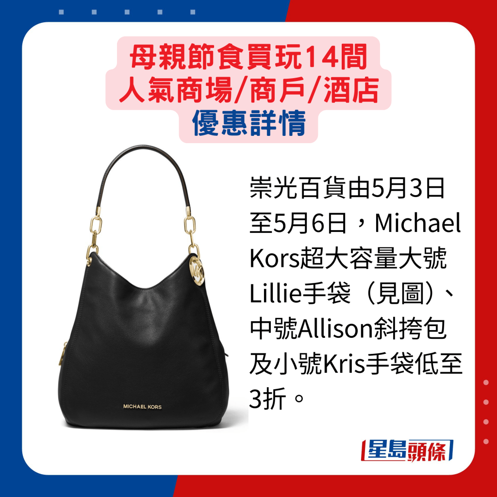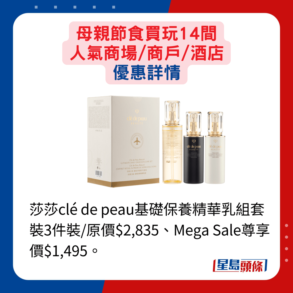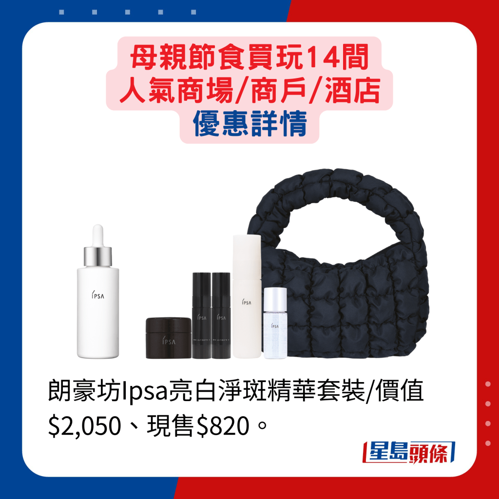 人氣百貨及商場商戶都有推出迎合母親節的推廣活動,產品網羅時裝配飾、護膚及美妝品等。崇光百貨由即日至5月26日舉行感謝祭,逾百國際品牌的指定產品提供不同折扣優惠,SOGO Rewards會員買滿指定金額,更可獲現金券或以優惠價換購指定產品等。想選購美妝護膚品的話,朗豪坊由即日至5月12日舉行Langham Beauty Fest S/S 2024,逾60個國際美容品牌如Shiseido、SK-II、YSL BEAUTé、Armani Beauty及IPSA等,推出超過300款低至3折的獨家禮遇、配搭優惠及限量激賞,例如Shiseido指定眼膜買一送一,另價值$2,050的IPSA亮白凈斑精華套裝,就減至$820發售。