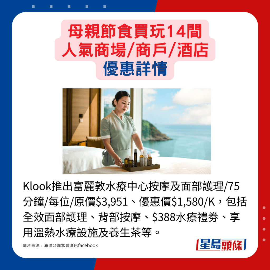旅游玩樂平臺網站Klook亦有推出酒店按摩及水療推廣,例如可以優惠價$1,580享受富麗敦水療中心的75分鐘按摩及面部護理,更可同時獲贈水療禮券、享用泳池及溫熱水療設施等,媽媽大可盡情享受Me Time。