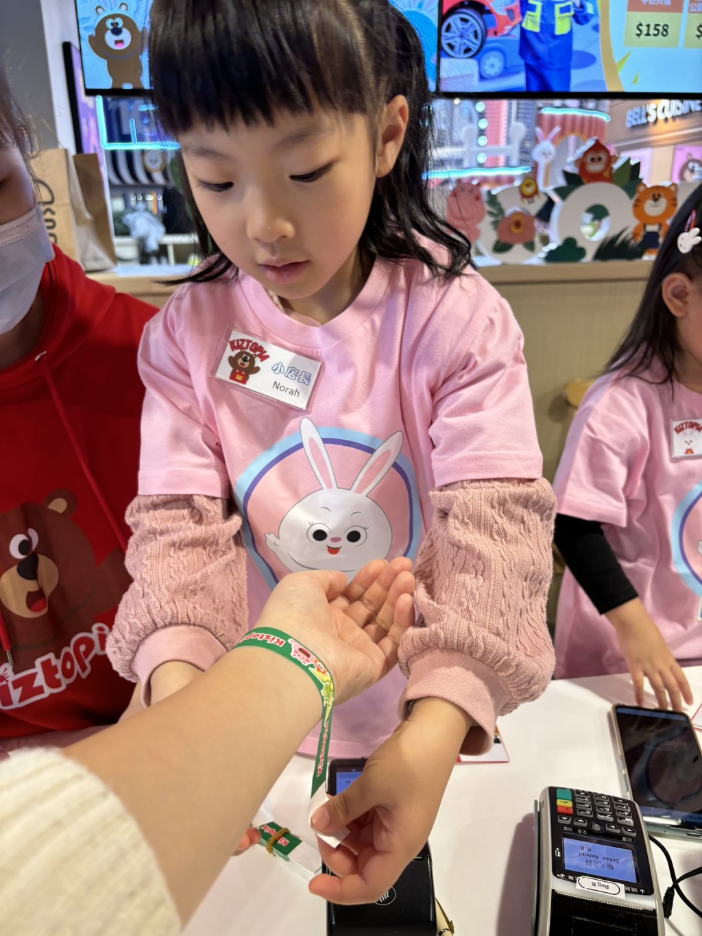 ▲小店長要為客人掃二維碼確認人數,并為客人戴上手帶,學習待客之道。(圖片來源:《親子王》)