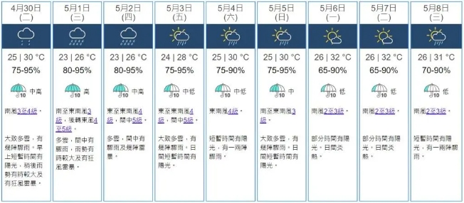 據香港天文臺29日消息,現時影響廣東東部沿岸的偏東氣流正逐漸被一股偏南氣流取代。同時,一道云雨帶正覆蓋廣東。香港天文臺表示,隨著一道低壓槽靠近華南沿岸,周二(30日)稍后及周三(5月1日)該區有大驟雨及狂風雷暴,周四(5月2日)天氣仍然不穩定。而一股偏東氣流會在本周中后期影響廣東東部沿岸。隨著低壓槽減弱,接近周末廣東沿岸驟雨減少,日間炎熱。