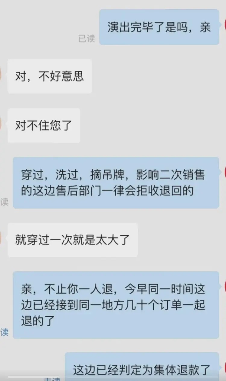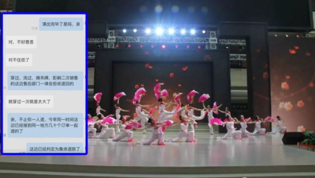 據網絡消息,指當地有中學生在電商平臺向出售演出服裝的商家,買了80多套表演服,但日前在演出完畢后,卻出現集體退貨潮。商家認為學生用完演出服表演后集體惡意退貨,更用“差評”作威脅,于是公開事件。