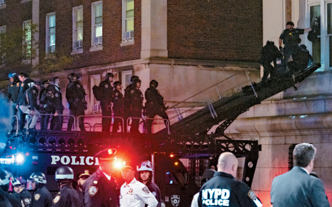 紐約市哥倫比亞大學校園內約數十名示威學生周二凌晨占領該校的“漢密爾頓大樓”(Hamilton Hall),矢言力抗所有驅離行動,以抗議以色列攻打加沙造成大量平民喪生。到周二晚上,數以百計穿戴戰術裝備的警察進入校區,抵達這棟教學大樓遭封鎖的前門時大喊:“我們要清場了?!敝辽?0名警察踏上云梯車伸出的長梯,經二樓的窗戶進入大樓清場。