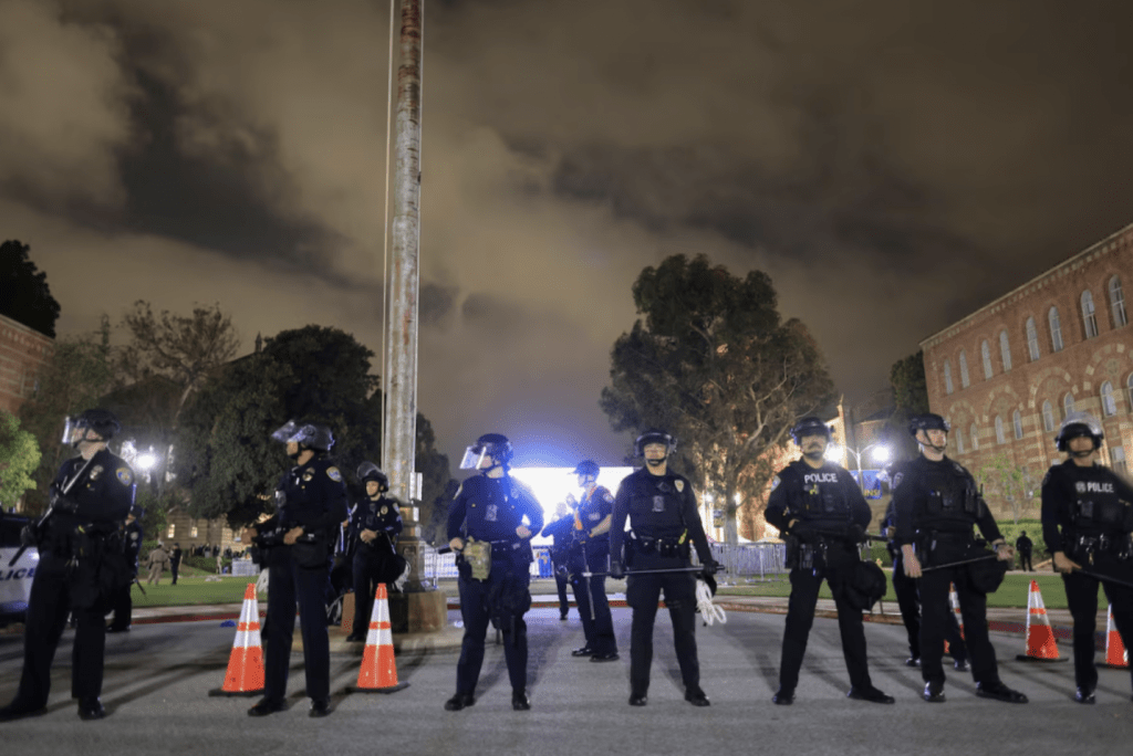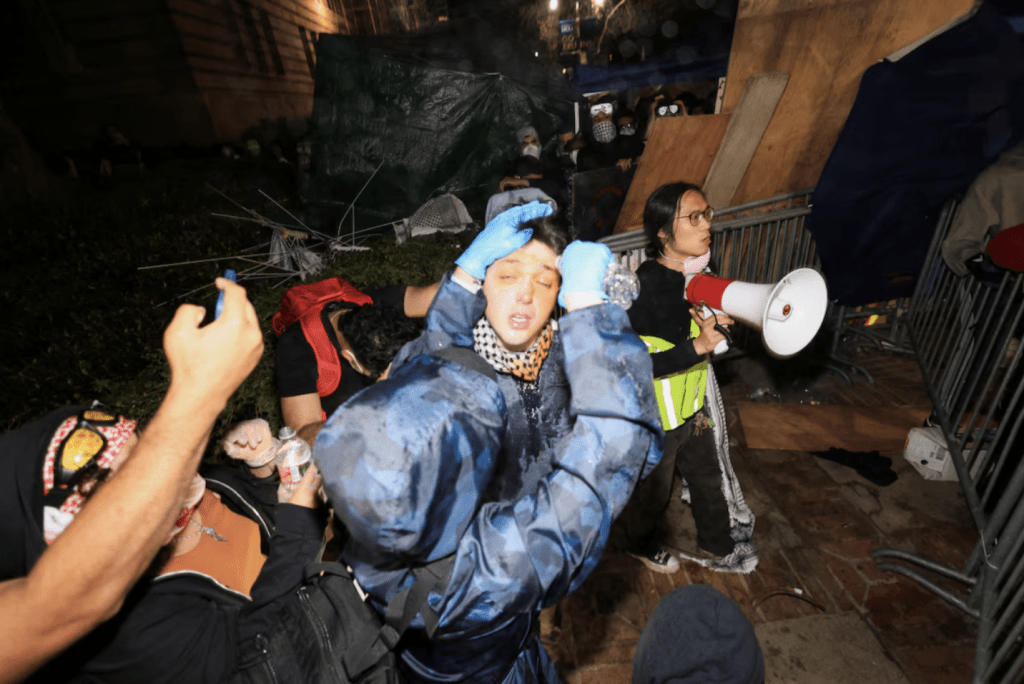 因以色列攻打加沙引發的美國校園示威浪潮緊張局勢不斷升級,當紐約警察強闖常春藤哥倫比亞大學拘捕及驅散占據校舍示威學生后,加州大學洛杉磯分校隨即爆發暴力事件。據報一群親以色列人士在校內先向挺巴示威者投擲煙火及襲擊,最終演變成互毆,警方到場拘捕多人。