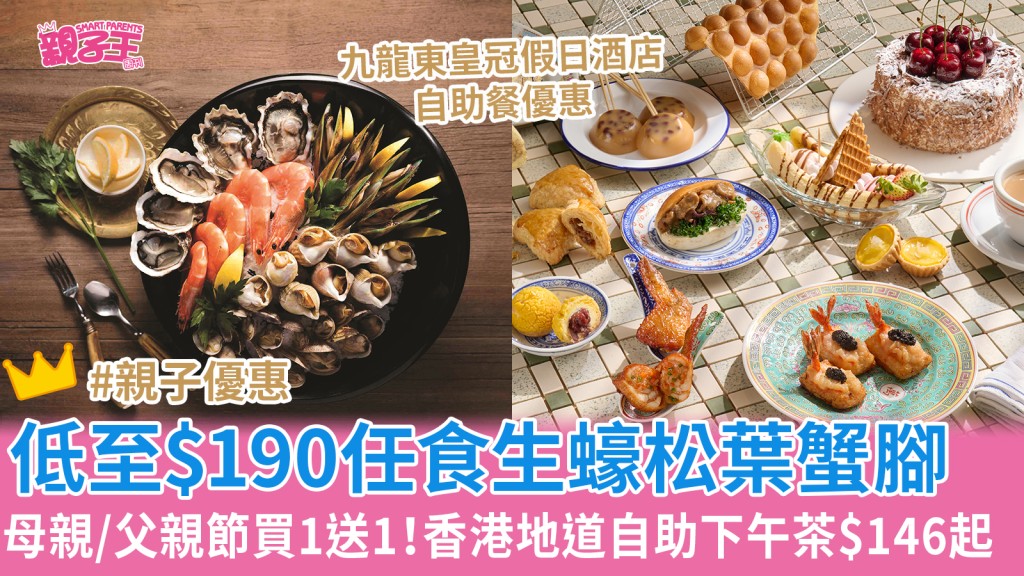 想母親節、父親節一家大細找個舒舒服服又多不同菜式選擇的地方用餐,酒店自助餐就是最佳選擇。 今日(2日)中午12點就有九龍東皇冠假日酒店自助餐優惠買一送一,只需$190起即可大嘆生蠔,小朋友又可盡情吃多款口味Haagen-Dazs雪糕與朱古力噴泉!自助晚餐更有松葉蟹腳、芝士焗龍蝦,都只是$326起;必試低至$146全新“香港地道”周末下午茶自助餐,父親節、母親節亦有買一送一優惠,更每位母親/父親送木瓜燉燕窩或 心太軟伴威士忌雪糕。 即睇自助餐優惠詳情及快搶連結。