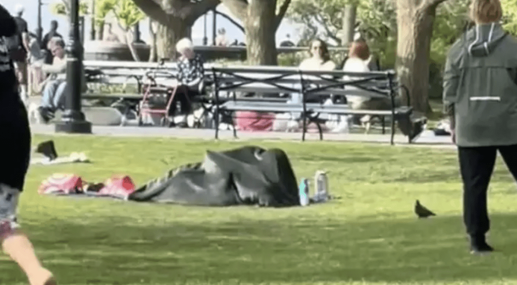 作為美國紐約最歷史悠久公園之一、搭乘自由女神像渡輪所在地的炮臺公園(Battery Park),平日有許多居民一家大小聚集休憩,但日前卻出現一段令人側目的影片,一對情侶在公園的草地上公然上演活春宮,眾目睽睽在毯子之下做出疑似親熱動作。影片在網上引起回響及瘋傳,短短幾日間瀏覽人次已超過5100萬。