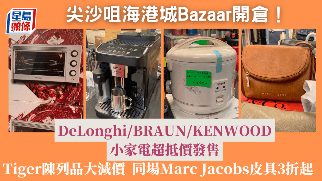 尖沙咀開倉|尖沙咀海港城展銷集今期舉行名牌家品及服飾大特賣,由即日起小家電及名牌服飾開倉大激減,多款DeLonghi、BRAUN、KENWOOD咖啡機、焗爐、電水壺等陳列電器及廚具特價發售,其中Tiger暖水壺、保暖壺及電飯煲以特賣價出售。除了小家電及家品以外,同場的名牌服飾開倉亦有小資女力捧的Marc Jacobs手袋、銀包低至3折起,不容錯過!