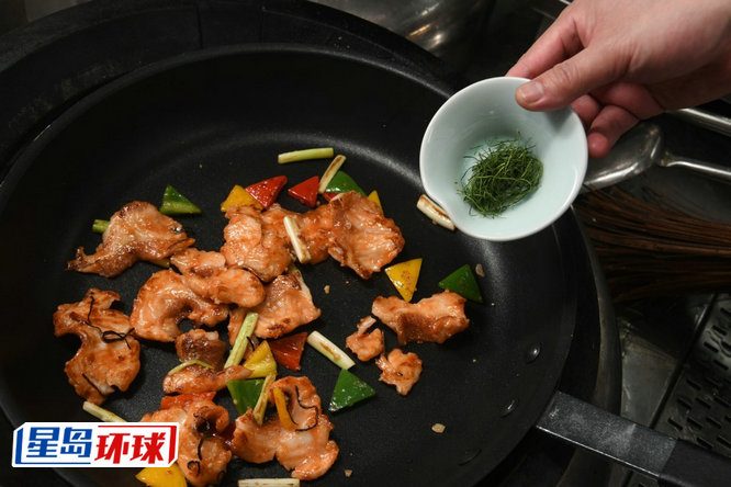 起油鍋爆香三色椒、蔥段,加蒜蓉、干蔥蓉略炒,加陳皮絲。