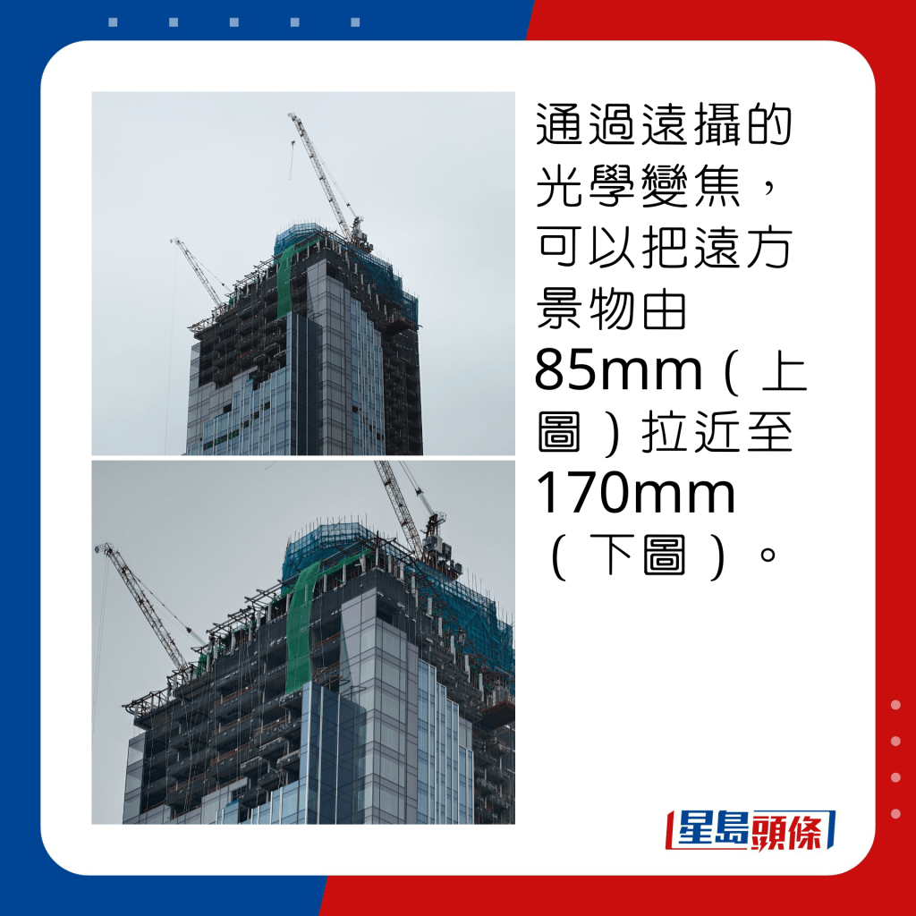 ▲通過遠攝光學變焦,可以把遠方景物由85mm(上圖)拉近至170mm(下圖)。