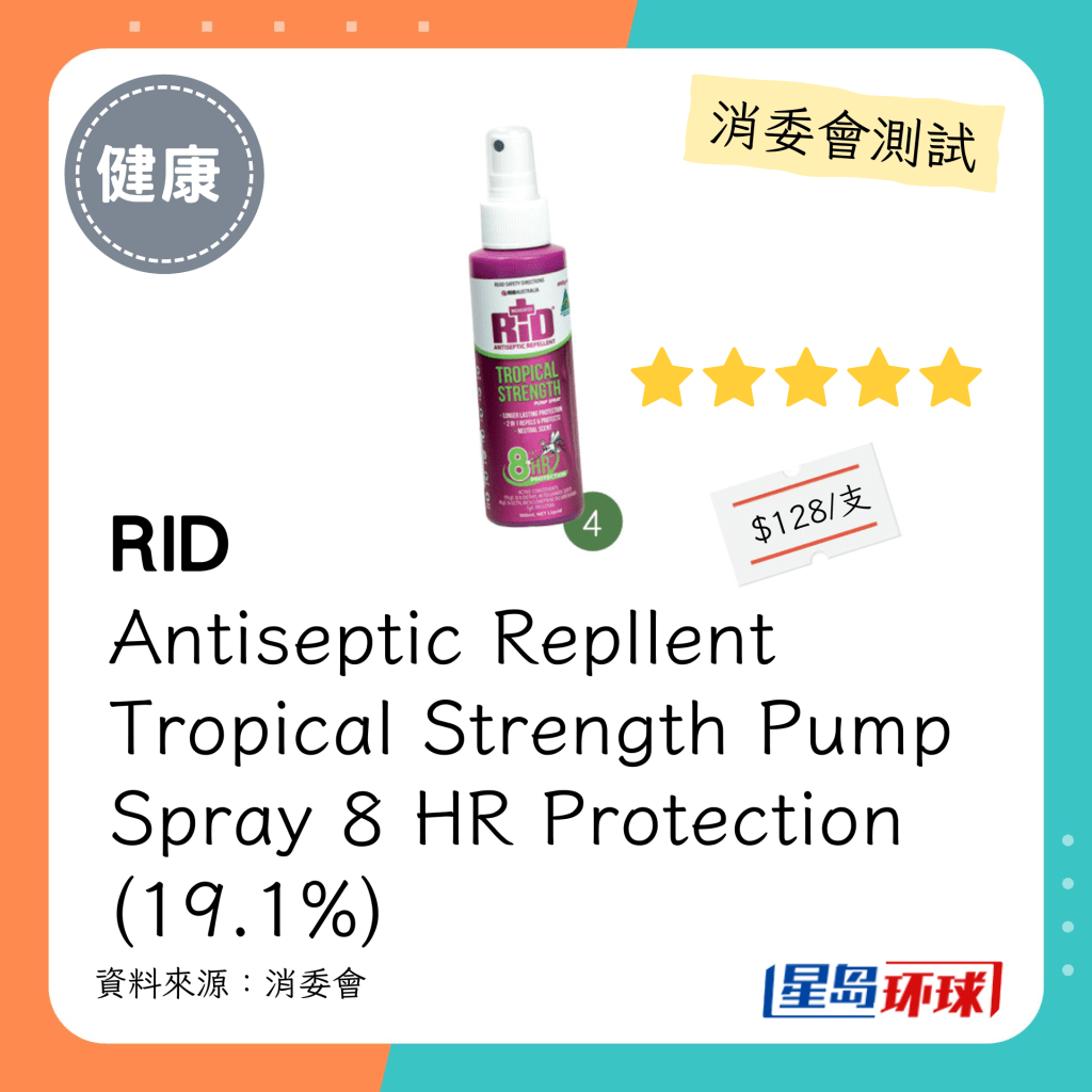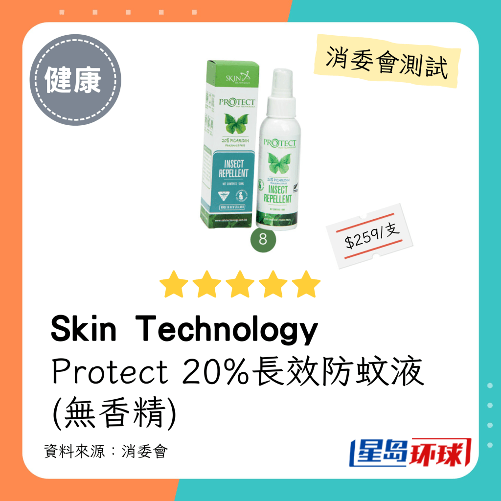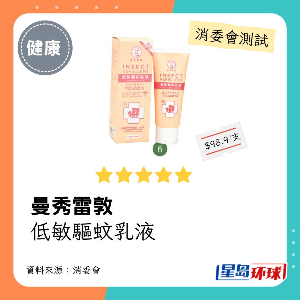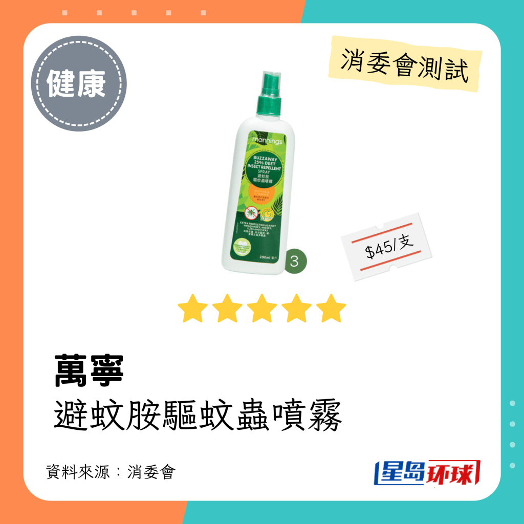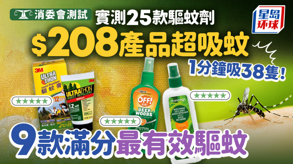 消委會測試后發現,近9成含避蚊胺 (DEET)或派卡瑞?。╬icaridin)的驅蚊劑涂搽4個小時后保護力仍維持80%或以上。 以下9款的驅蚊整體表現獲5星滿分,其中包括“3M”、“萬寧”等品牌。