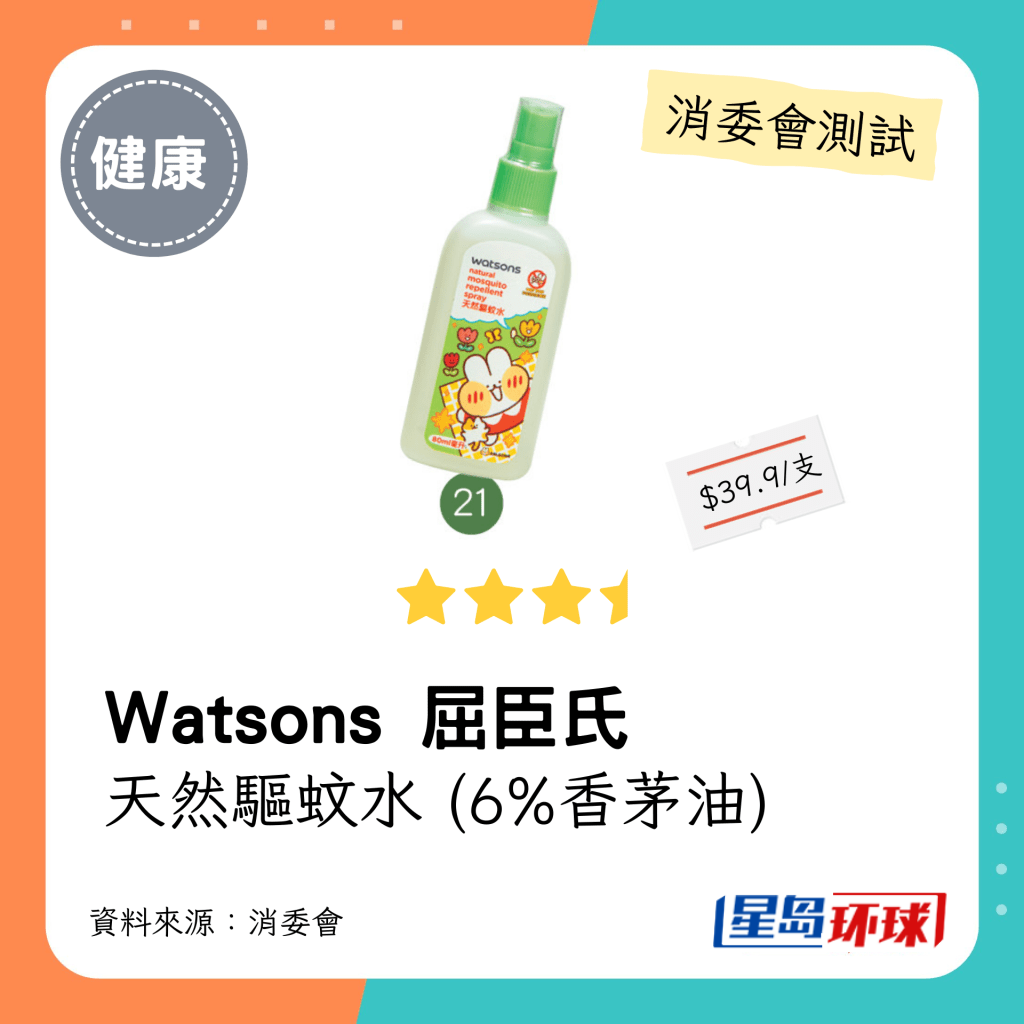 Watsons Natural Mosquito Repellent Spray 屈臣氏天然驅蚊水 (6%香茅油):10%,總評3星半