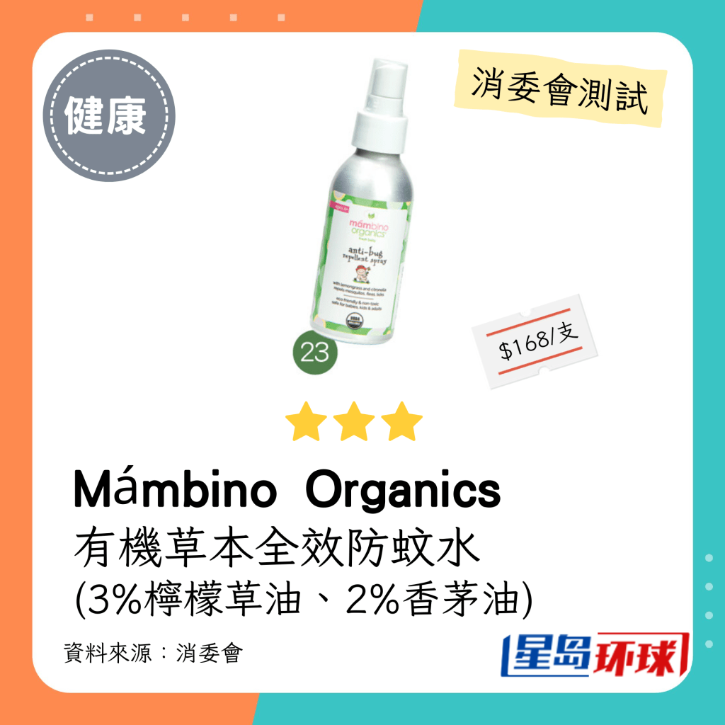 Mámbino Organics Anti-Bug Repellent Spray 有機草本全效防蚊水 (3%檸檬草油、2%香茅油):0%,總評3星