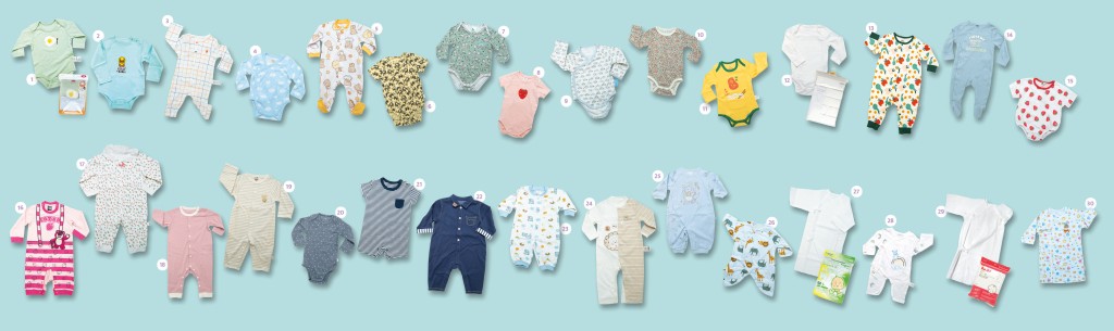 消委會所購的30個樣本,均聲稱適合2 歲或以下嬰幼兒穿著的衣物,有連身衣、包臀衣、以及俗稱“和尚袍”或“蝴蝶衣”的襟衣,平均每件售價由$22 至$419 不等,其中4 款的總評分達最高的5 星,分別是售價$139(2件)Topvalu的連身衣,售價$269的B.Duck baby的衣物,售價$408的Happyland衣物,以及售價$118雞仔嘜CHICKS 長袖側鈕蛤衣,而售價最貴達$419的balabala的baby jumpsuit,整體評分則只有3星。