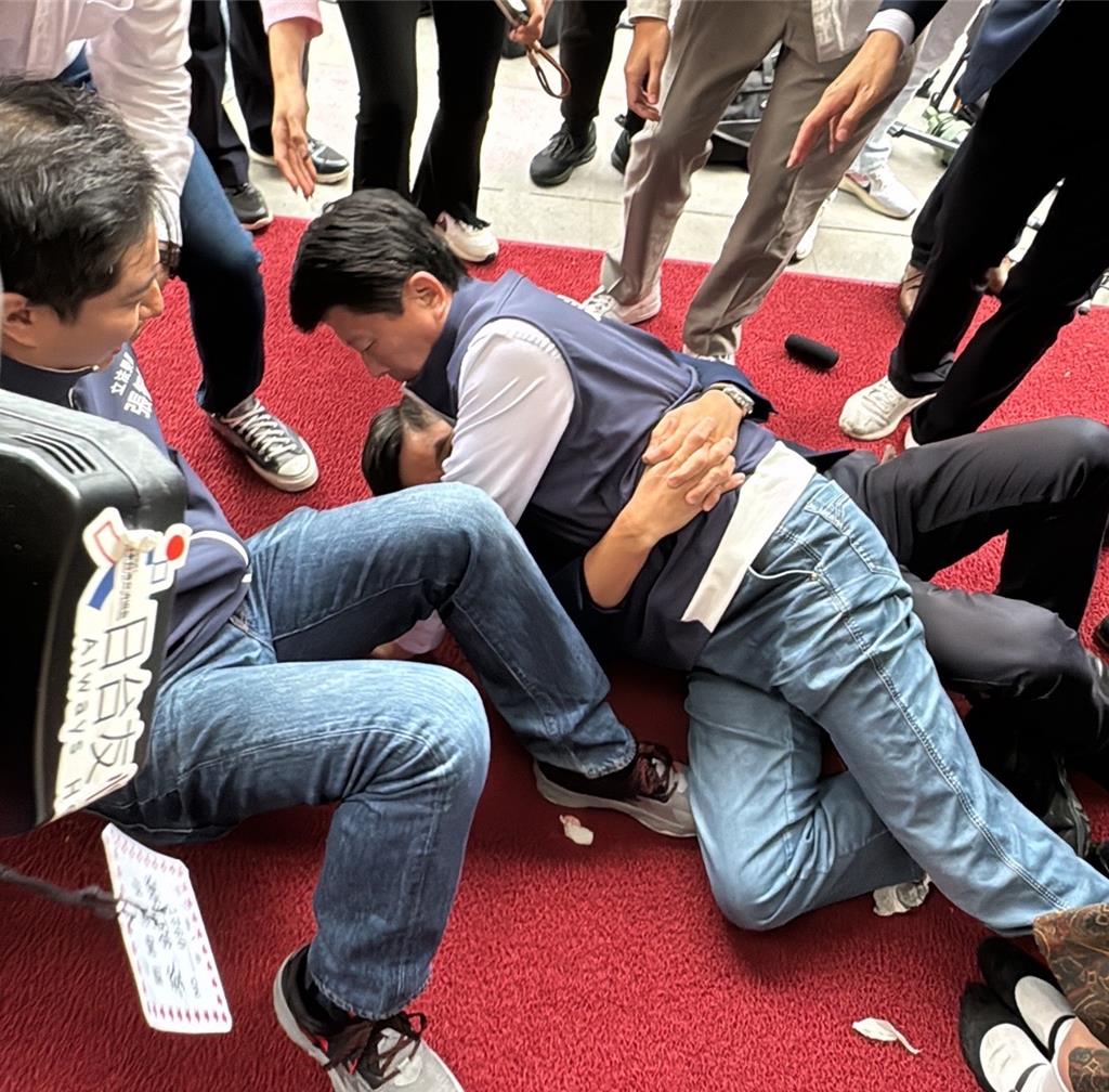 然而不只場內沖突不斷,議場門口在7時就爆發嚴重推擠沖突,藍委甲級動員搶在七點送案,與綠委發生推擠,可以看見女藍委出現尖叫聲。其中謝龍介和鍾佳濱近身肉搏、郭國文一度用用手推黃國昌的臉、王美惠更在混亂中把駐衛警的小帽扯下。后來進到議場內可見到藍白“立委”成功搶占主席臺,立委徐巧芯更在場內“吹直笛”,陳玉珍也是全副武裝;進到議場后,藍綠隔著主席臺互嗆、互罵,現場氣氛緊張。