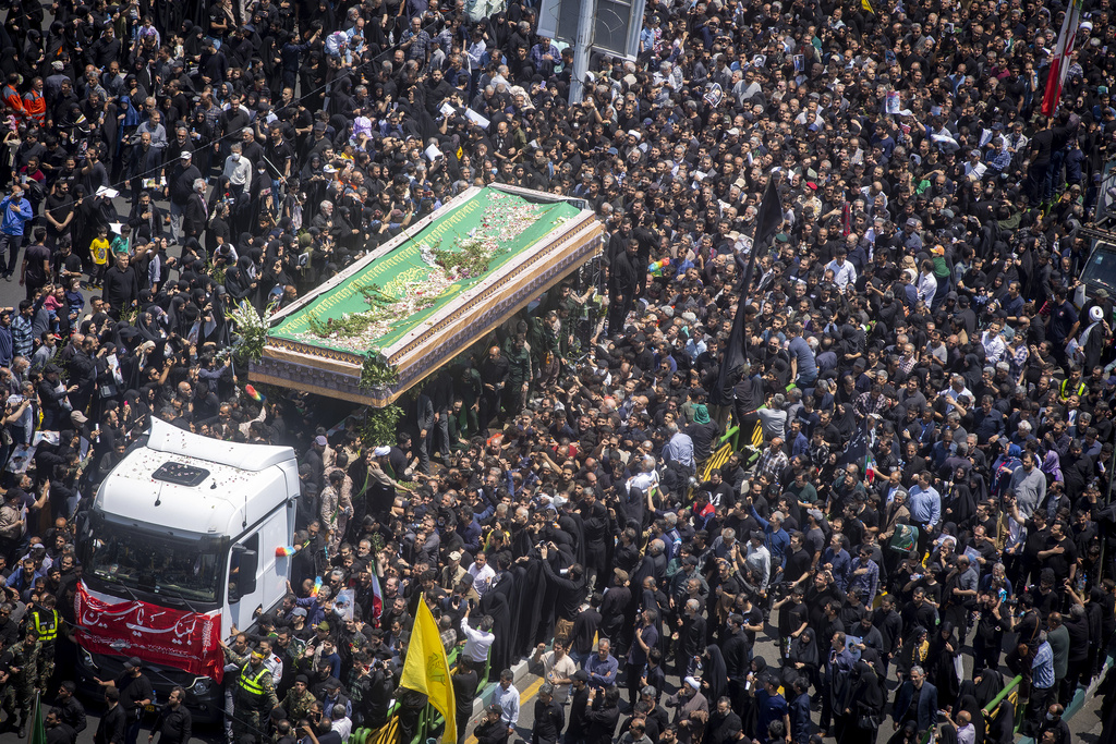伊朗政府周三在首都德黑蘭,為萊希、外長阿卜杜拉希揚和其他6名在直升機墜機事故中的遇難者舉行葬禮。哈梅內伊在德黑蘭大學主持祈禱活動,有數萬名民眾參加,死者的棺木上蓋上伊朗國旗,伊朗代理總統穆赫貝爾在儀式上落淚。靈柩被放在拖車上,并穿過德黑蘭市中心,前往阿扎迪廣場等,萊希生前曾在該處發表演講。