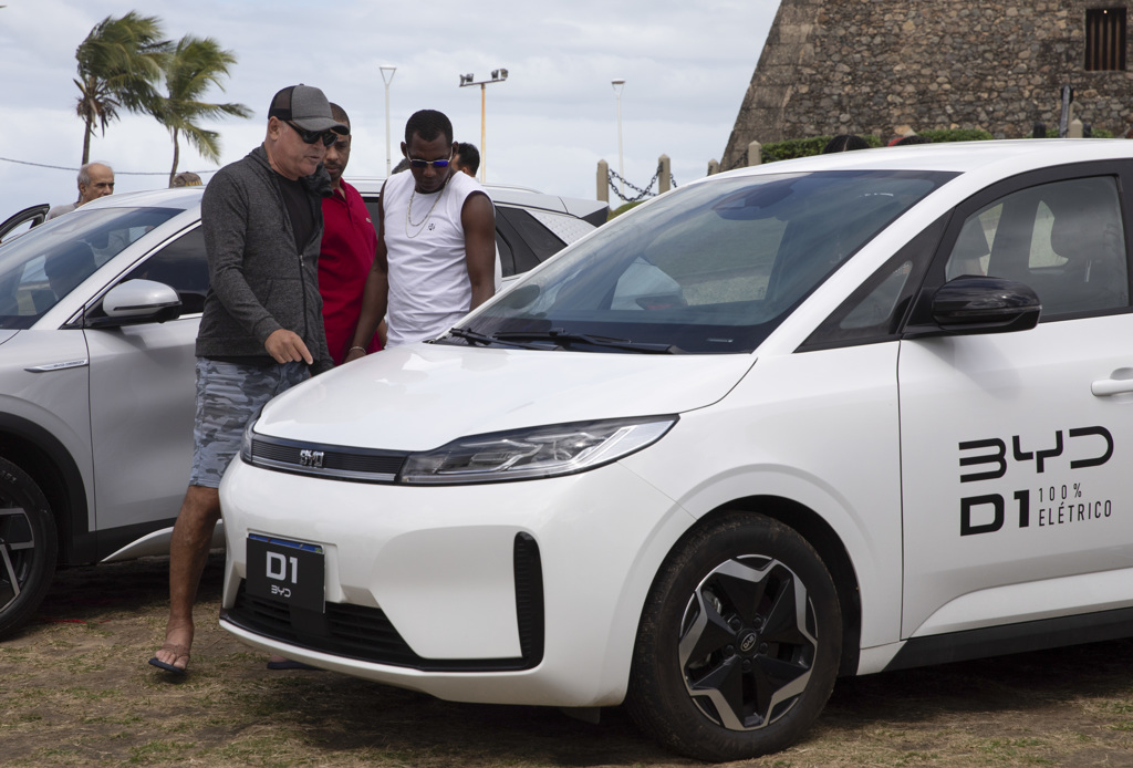 ▲中國電動車在中南美洲大受歡迎,業績成長迅速。圖為巴西巴伊亞州首府薩爾瓦多的民眾參觀比亞迪電動汽車。(圖/新華社)