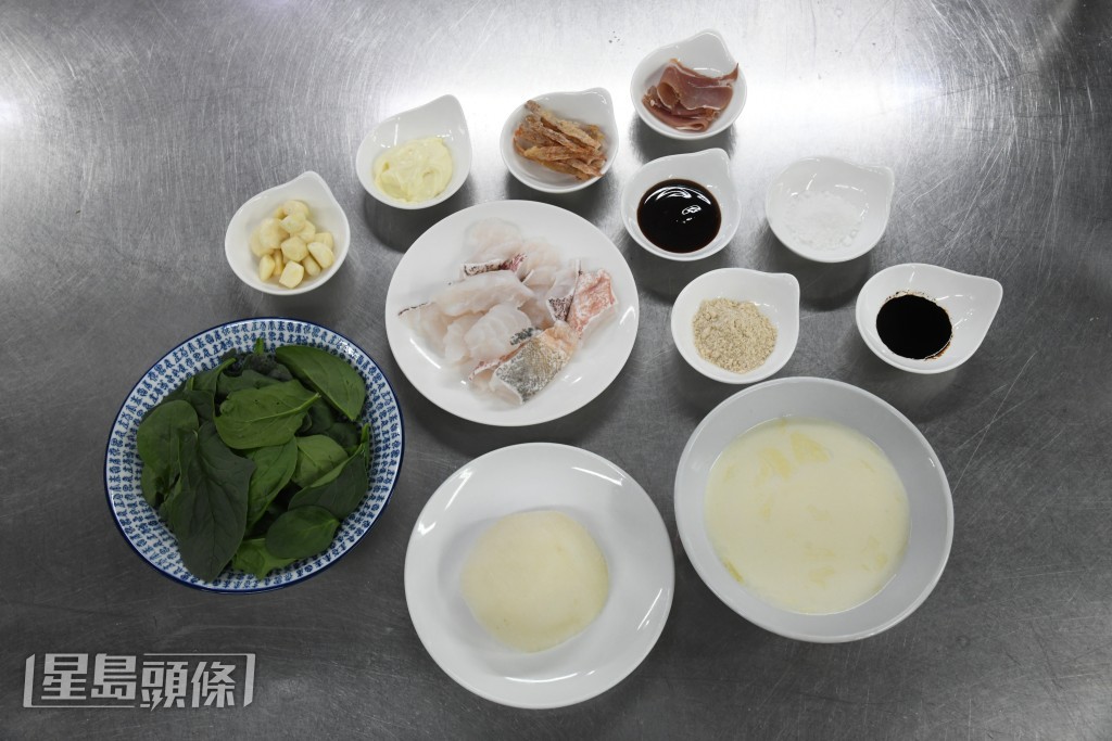 2. 用滾油炸香蒜頭及蝦干備用,菠菜汆水備用。