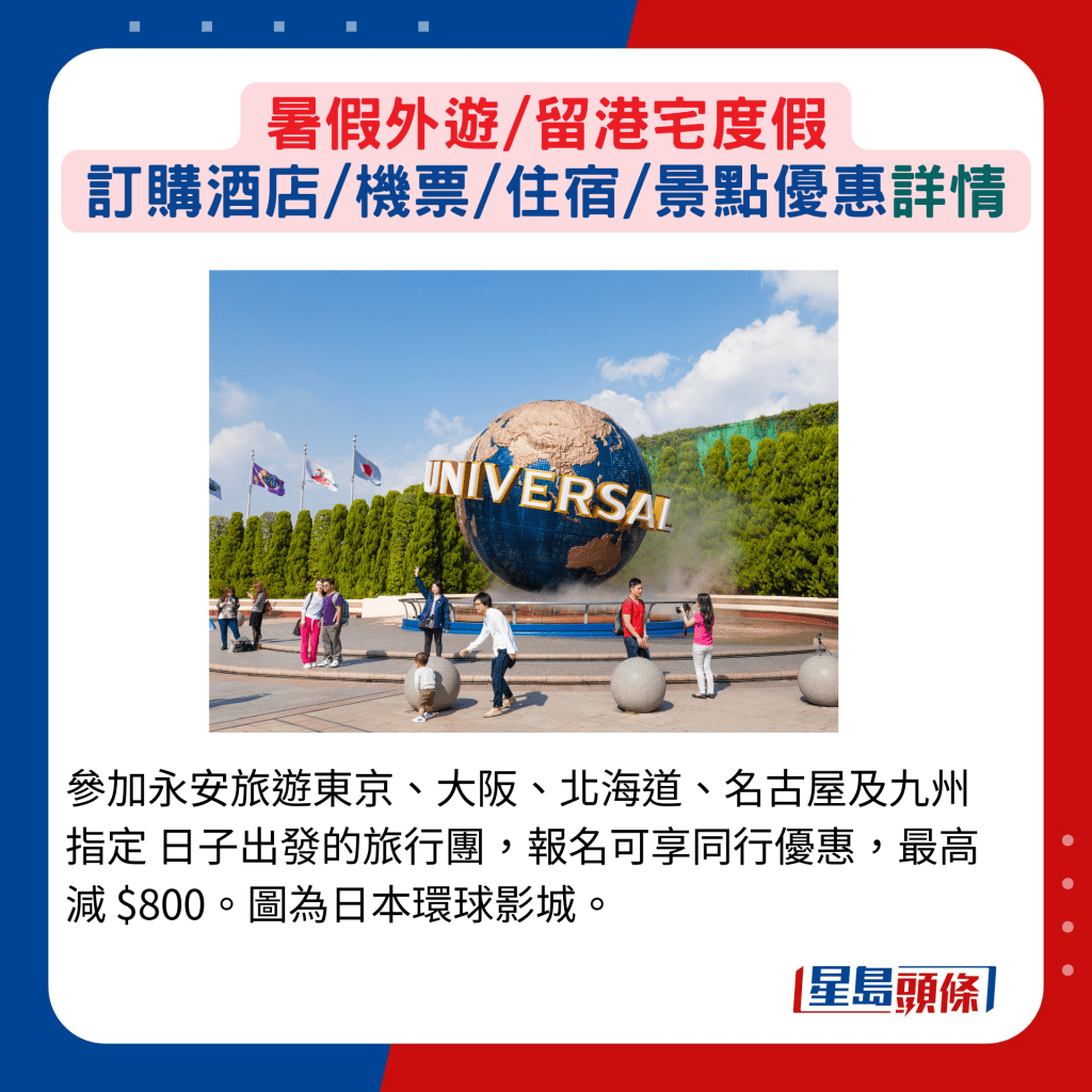 參加永安旅游東京、大阪、北海道、名古屋及九州指定日子出發的旅行團,報名可享同行優惠,最高減 $800。 圖為日本環球影城。