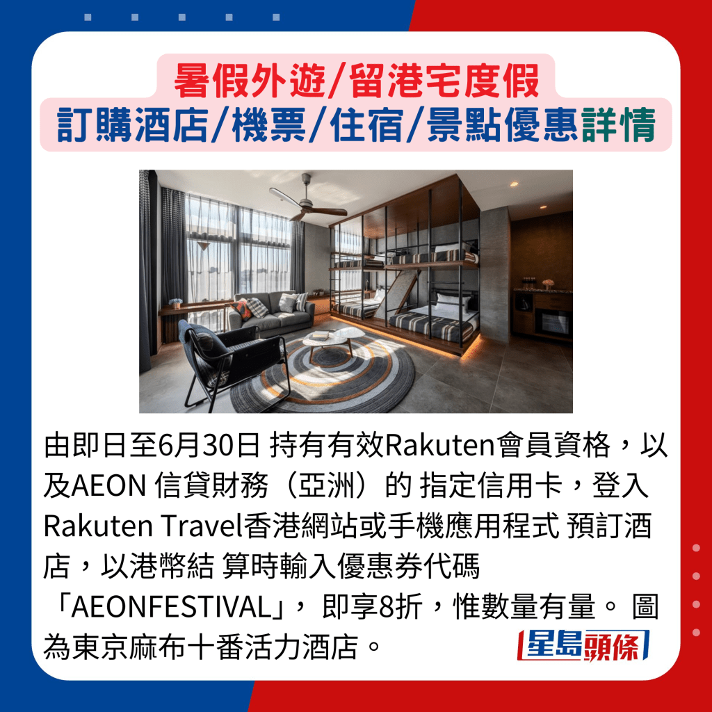 由即日至6月30日持有有效Rakuten會員資格,以及AEON 信貸財務(亞洲)的指定信用卡,登入Rakuten Travel香港網站或手機應用程序預訂酒店,以港幣結算時輸入優惠券代碼AEONFESTIVAL,即享8折,惟數量有量。 圖為東京麻布十番活力酒店。