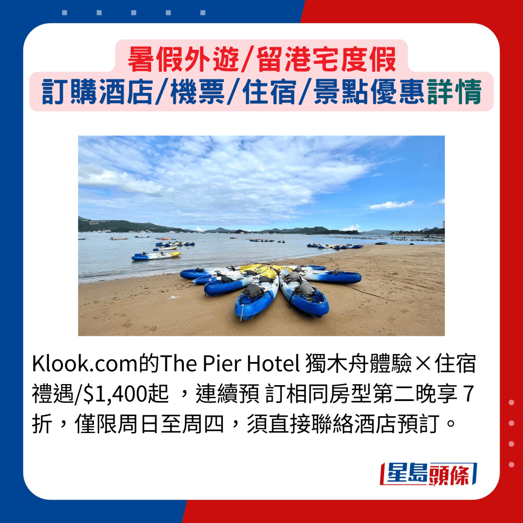 至于Klook.com推出西貢The Pier Hotel住宿連餐飲優惠,其中獨木舟體驗×住宿禮遇,包括獨木舟租用及24小時私家車泊車優惠等,預訂相同房型第二晚7折,限周日至周四,須直接聯絡酒店預訂。