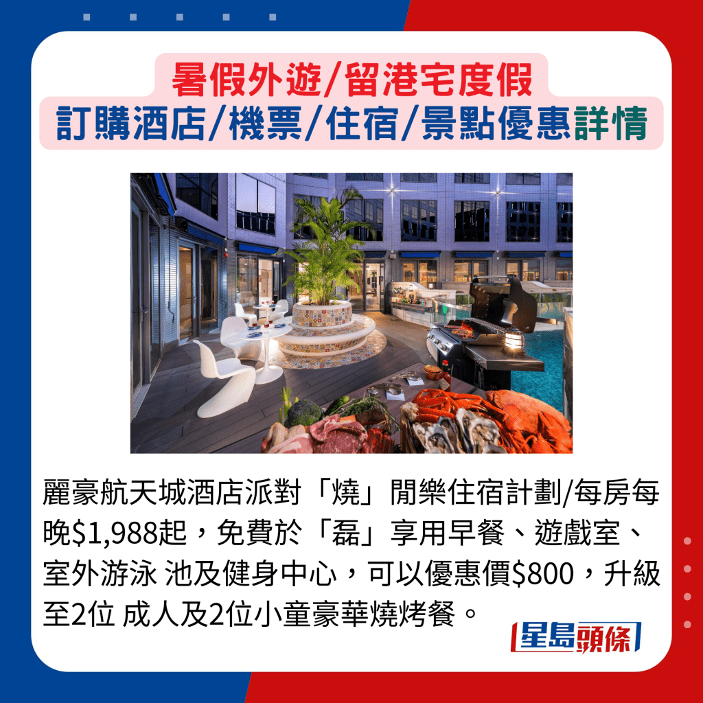 去香港度假的話,可選擇切合個別喜好的酒店住宿計劃,同樣可以享受度假樂趣。遠離市區繁囂的酒店最能感受度假氛圍,位于大嶼山的麗豪航天城酒店由5月25日至8月30日推出派對“燒”閑樂住宿計劃,包括Cabana客房、主題家庭套房連露臺及4合1Cabana派對客房等,可于露臺或戶外庭院享燒烤樂,又可以優惠價升級為燒烤豪華套餐,此外亦有提供免費早餐,同時可享用游戲室、室外游泳池及健身中心。