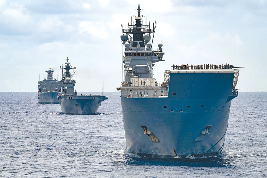 ▲澳洲皇家海軍“坎培拉”號、“補給”號和“瓦拉門加”號與其他37艘艦艇,在2022年環太演習編隊航行。 美聯社