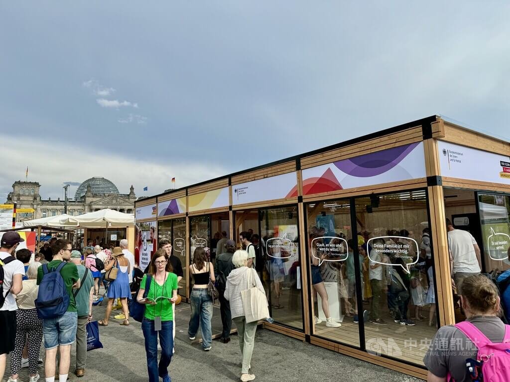 ▲柏林上周末展開為期三天的基本法75周年慶?;顒?,聯邦政府各部門于國會大廈前向民眾介紹部門的日常工作與政策目標。圖源:中央社