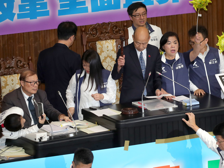 ▲“立法院院會”28日續審“國會改革”相關法案,傍晚時全案三讀包裹表決,國民黨、民眾黨以人數優勢完成三讀程序,“立法院長”韓國瑜(前排左二)在三讀通過后敲槌。中時新聞網