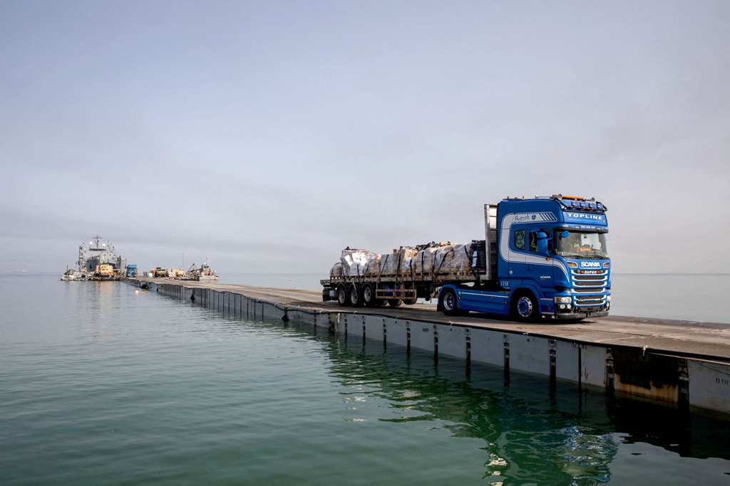 ▲畫面為19日一輛貨車載運救援物資通過加薩臨時碼頭。(圖/路透社、美軍中央司令部提供)
