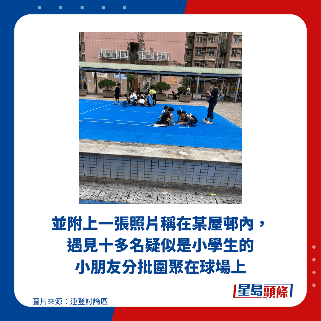 ▲并附上一張照片稱在某屋邨內,遇見十多名疑似是小學生的小朋友分批圍聚在球場上。