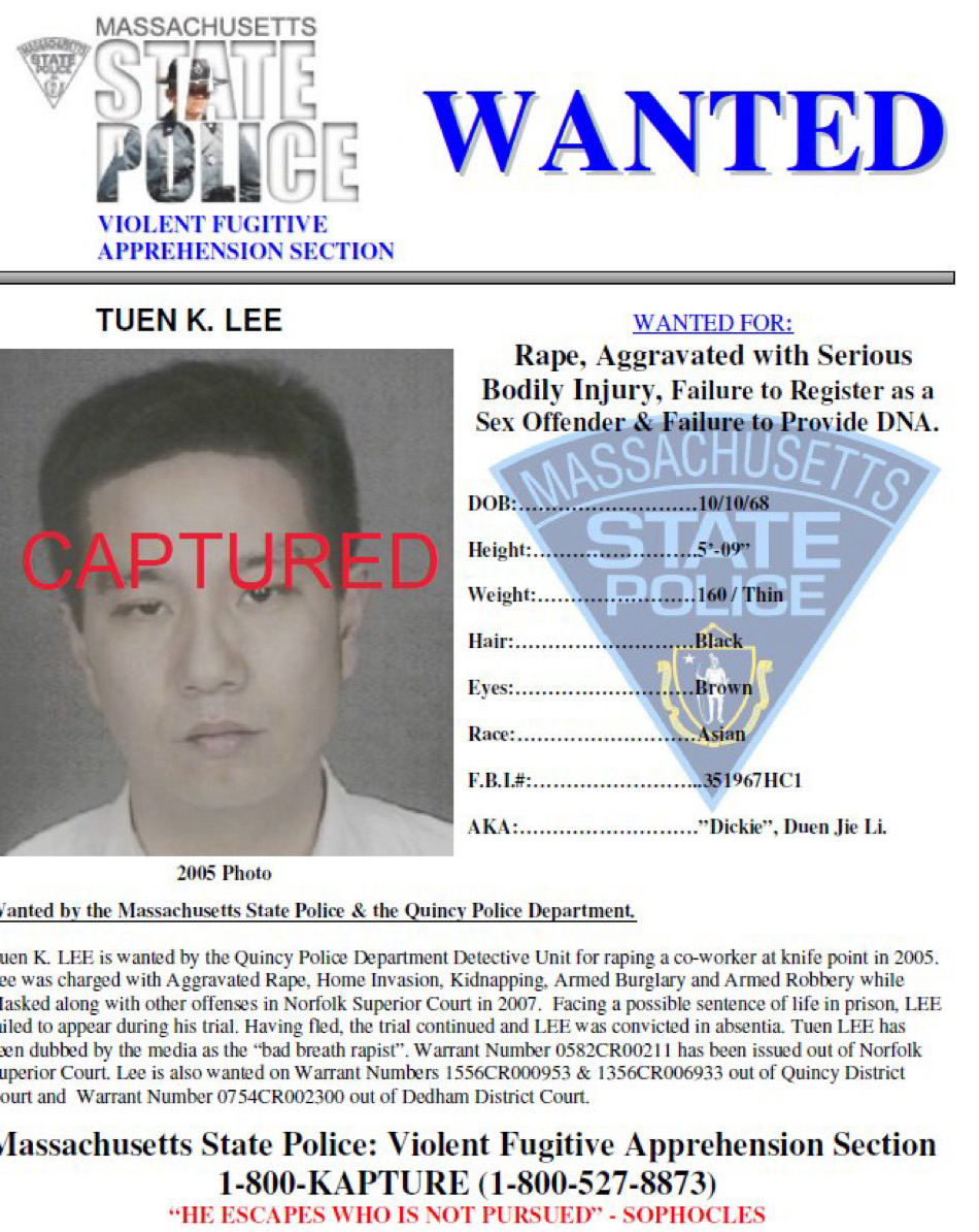 麻省警方隨后懸賞1萬美元(約7.8萬港元)追捕李端杰。電視節目《美國頭號通緝犯》(America’s Most Wanted)也曾多次提及此案。之所以有“口臭強奸犯”的稱號,是因為除了DNA罪證,受害人也憑口氣認出李端杰。